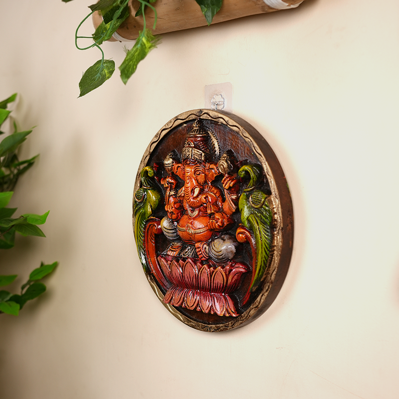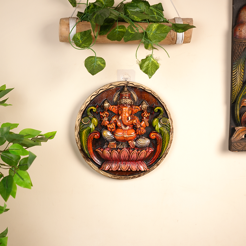 This stunning round wooden panel showcases Lord Ganesha seated gracefully on a lotus, symbolizing wisdom, success, and new beginnings. Flanked by two beautifully carved peacocks, the design reflects harmony and auspiciousness. Handcrafted by skilled artisans, the intricate detailing and rich tones of orange, green, and gold bring depth and divinity to any space. A perfect piece to adorn your pooja room or living area, radiating blessings and traditional charm.