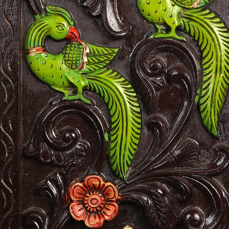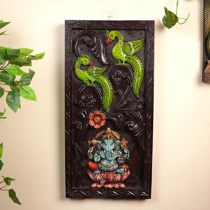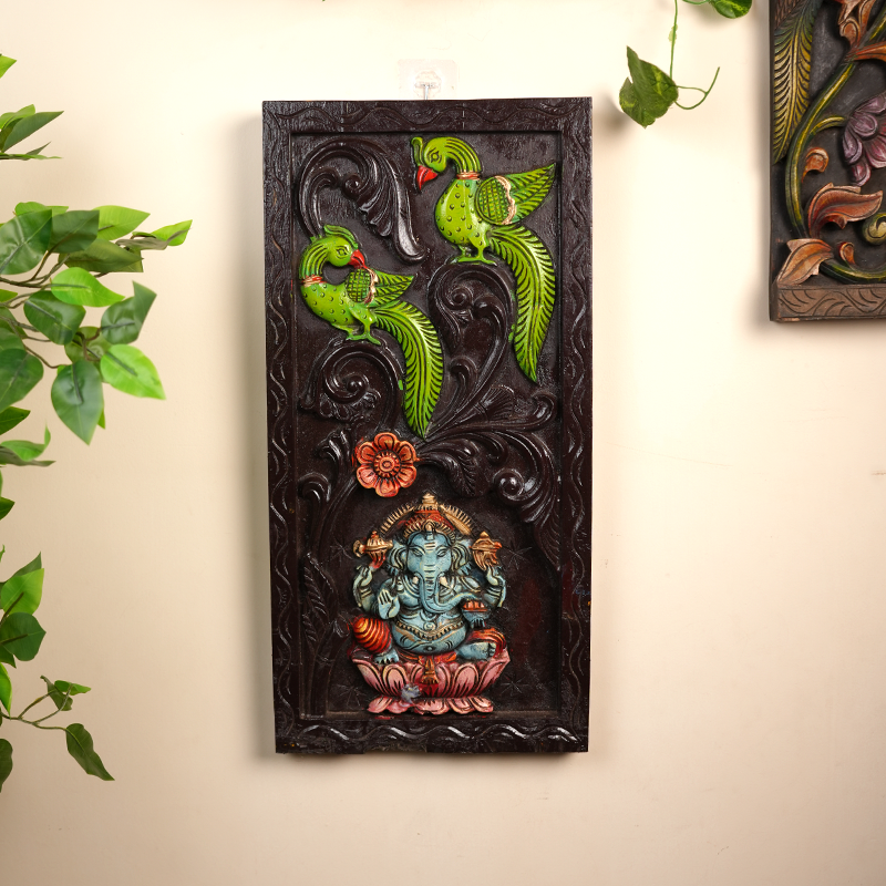 This exquisite hand carved wooden wall panel features Lord Ganesha seated gracefully on a lotus, symbolizing wisdom and prosperity. Above him, two intricately carved parrots represent love, harmony, and divine energy. The rich combination of earthy tones, with vibrant greens and blues, showcases traditional craftsmanship at its finest. Perfect for pooja rooms, living spaces, or gifting, this piece blends devotion and artistry to bring serenity and charm to your home.
