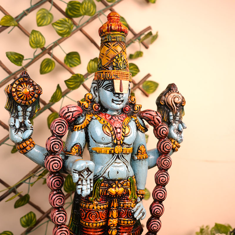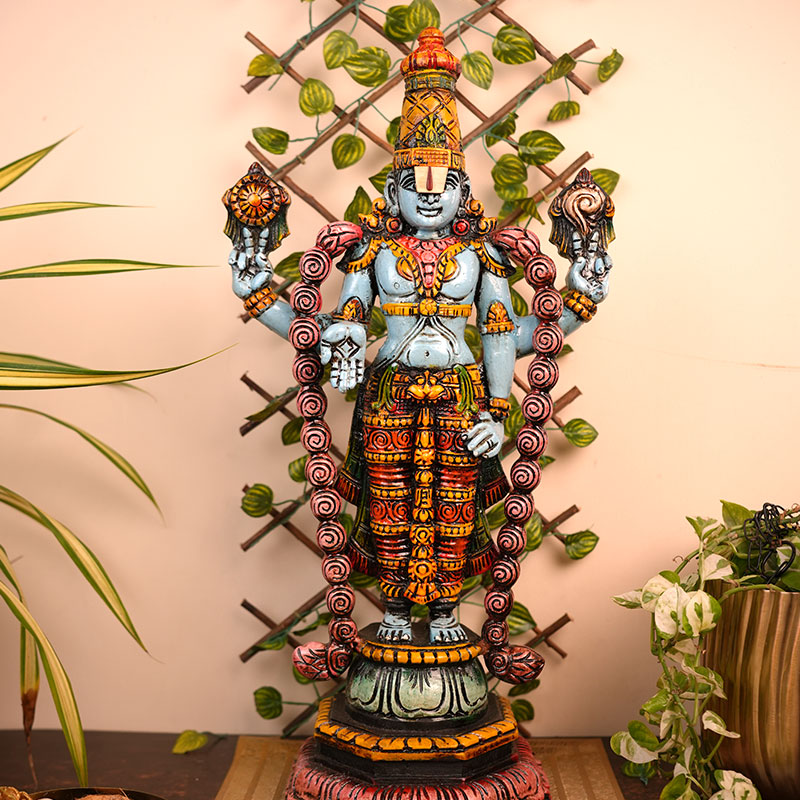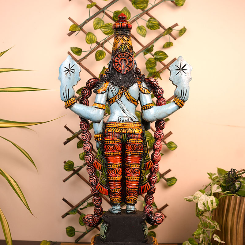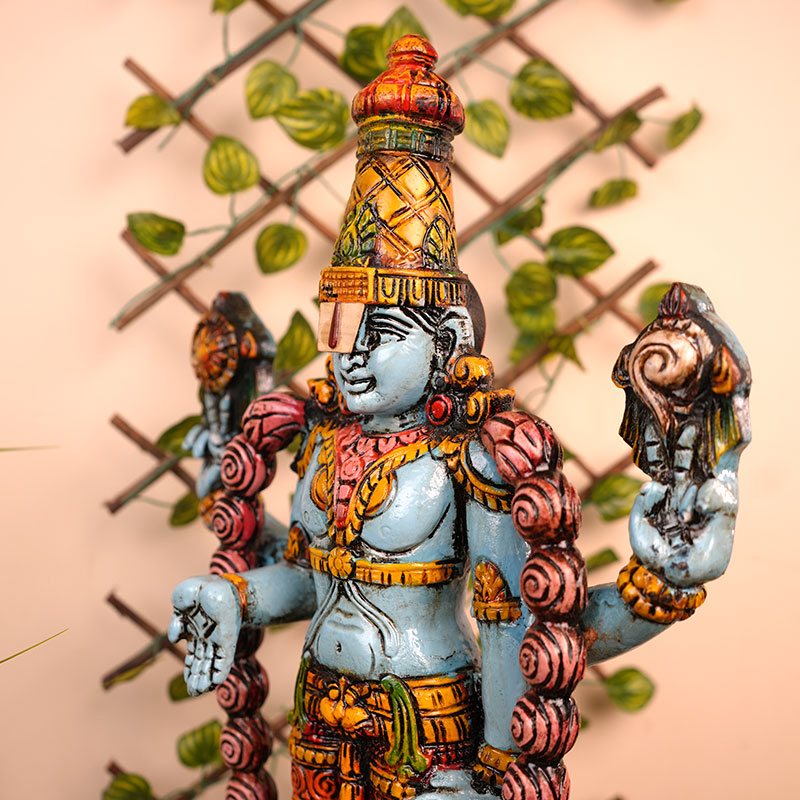 This magnificent hand carved wooden sculpture depicts Lord Vishnu in his divine form, radiating serenity and protection. Crafted by skilled artisans, the idol showcases intricate detailing from the sacred symbols in his hands to the elaborate crown and flowing garland. The blend of soft blue tones with rich reds, golds, and blacks brings depth and spiritual vibrance to the piece. Perfect for pooja rooms or as a statement decor element, this idol embodies divinity, craftsmanship, and timeless devotion.