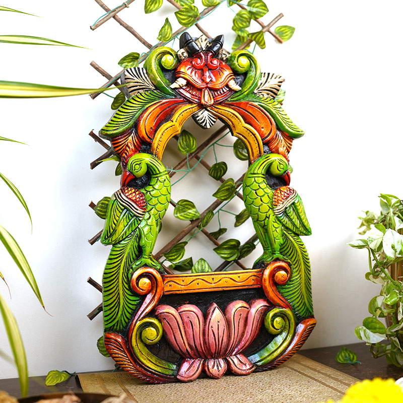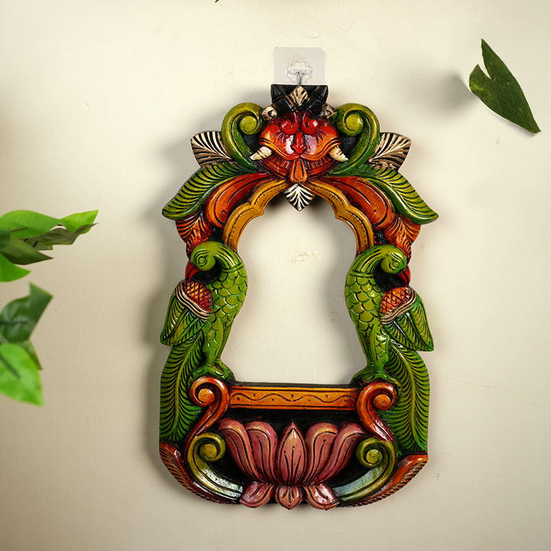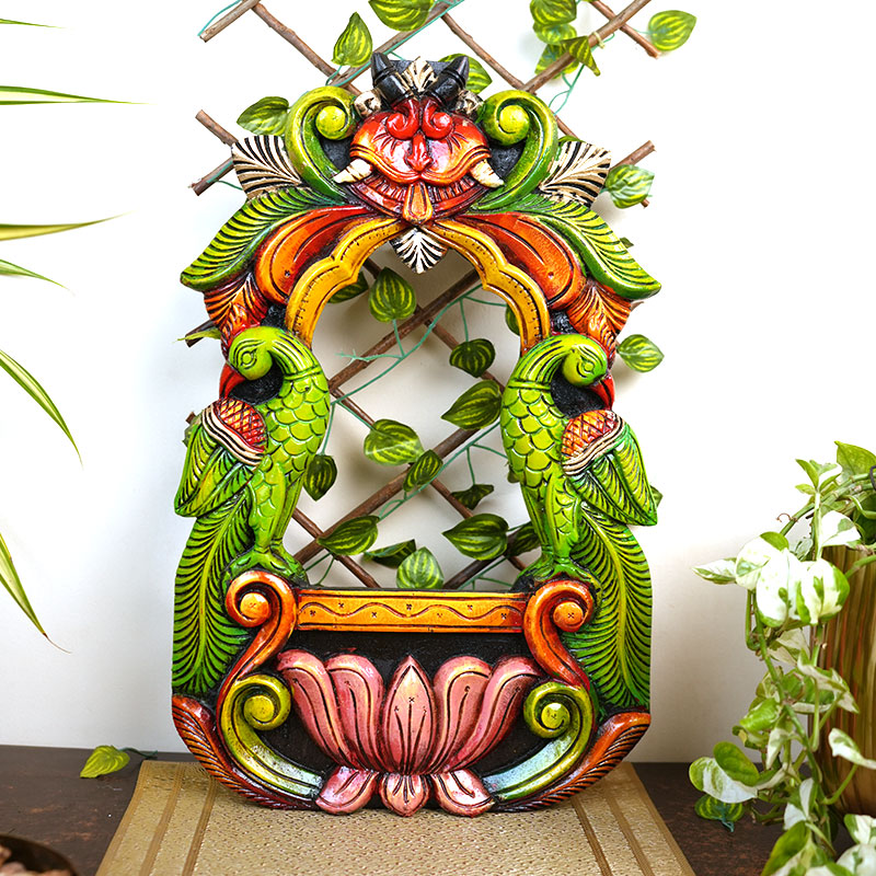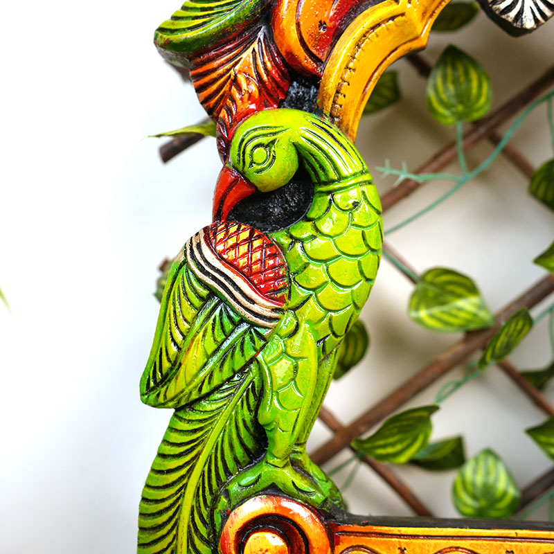 This exquisite hand carved wooden frame showcases two beautifully detailed parrots facing each other, symbolizing love, joy, and harmony. The arch design, adorned with floral and leaf motifs, reflects traditional South Indian temple craftsmanship. Rich hues of green, red, and gold add depth and vibrance, making it a striking piece of art. Ideal for framing idols, mirrors, or as a standalone wall decor, this handcrafted masterpiece brings a touch of divine elegance and cultural charm to any space.
