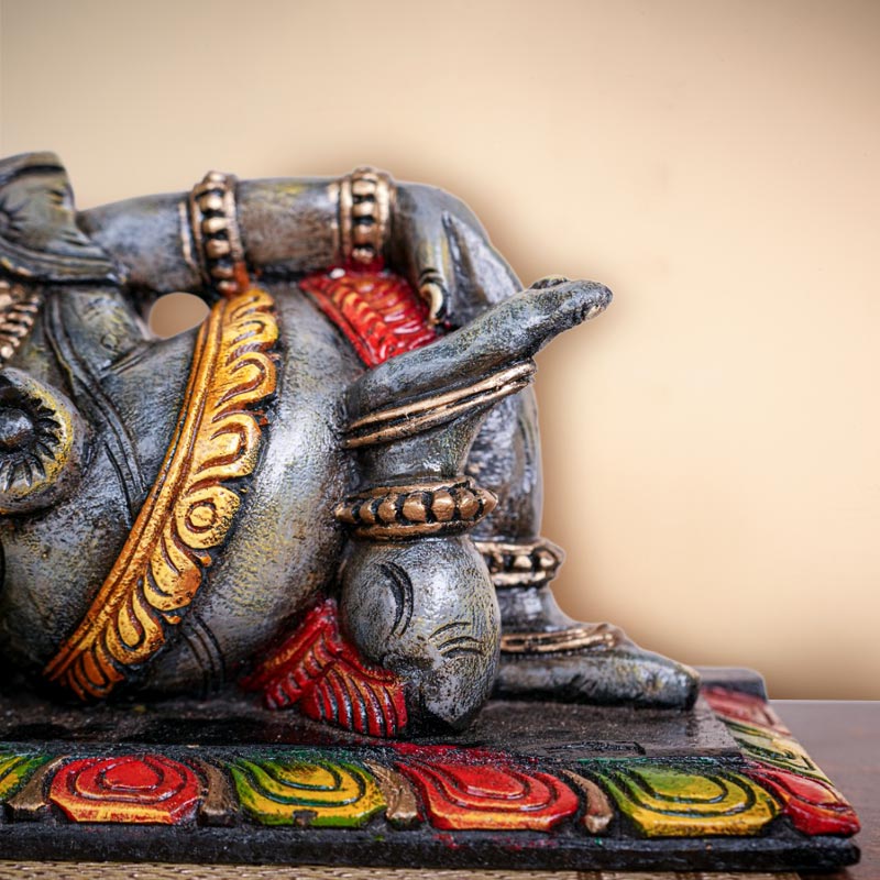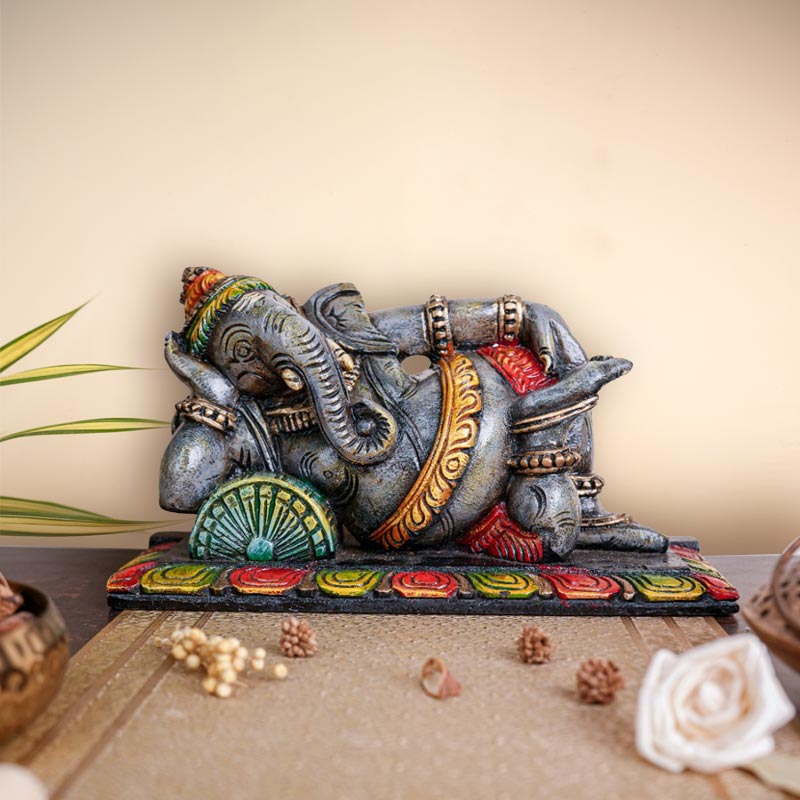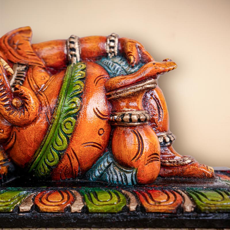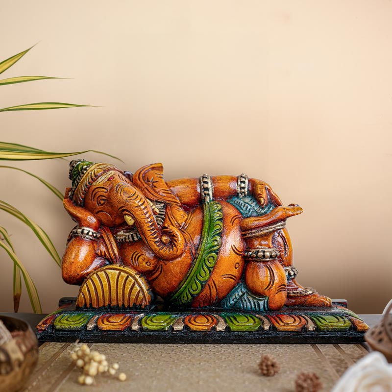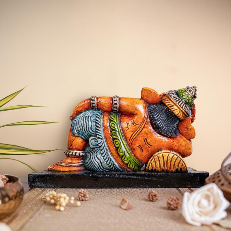 This exquisite hand carved wooden sculpture depicts Lord Ganesha in a peaceful reclining pose, symbolizing prosperity, relaxation, and inner contentment. Crafted by skilled artisans, the idol features intricate detailing and vibrant natural hues of orange, green, and gold that bring divine charm to any space. Perfect for home décor, gifting, or spiritual corners, this piece embodies both artistry and auspicious energy.