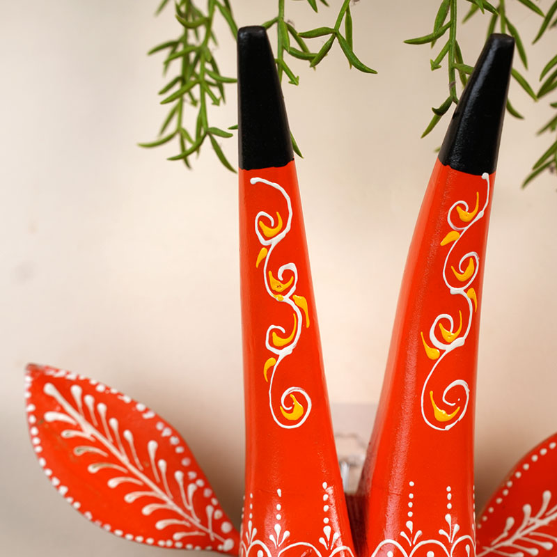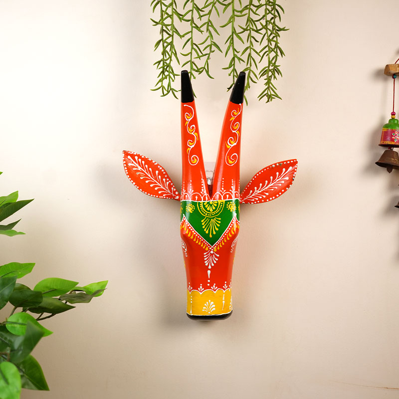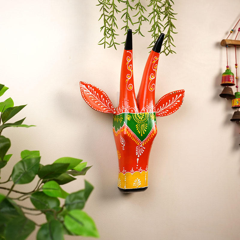 This vibrant hand painted cow head wall planter is a unique blend of art and functionality. Crafted in bright shades of red, green, and yellow with delicate folk art patterns, it adds a lively and decorative touch to any wall. The sculpted ears and antlers give it a charming character, while the planter space allows you to display trailing or small plants beautifully. Made by skilled artisans, it reflects traditional craftsmanship with a modern twist. Perfect for living rooms, balconies, or creative corners, it brings nature and art together in a striking way.