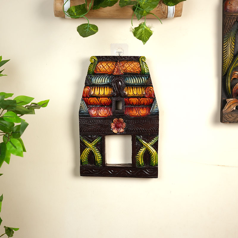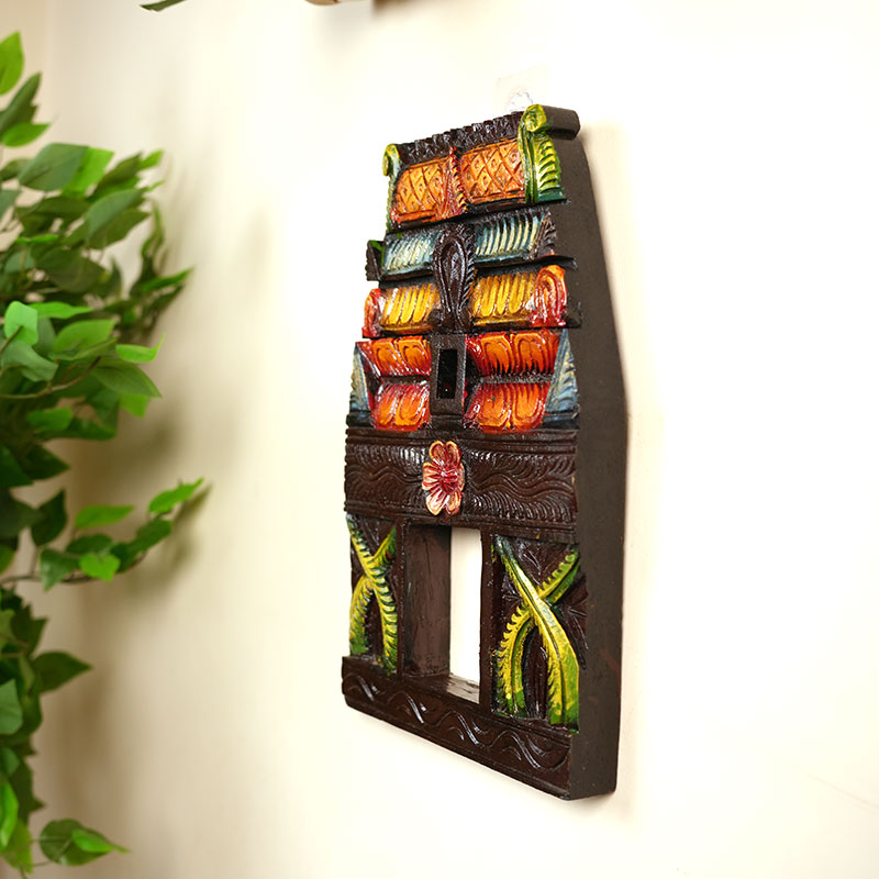 This stunning hand-carved wooden piece is inspired by the intricate Gopuram (temple tower) architecture of South India. Crafted with precision and adorned with vibrant hues of red, yellow, green, and gold, it beautifully captures traditional temple artistry. The floral and leaf carvings add to its divine charm, making it a perfect addition for pooja rooms, wall decor, or as a cultural statement piece that reflects heritage and devotion.