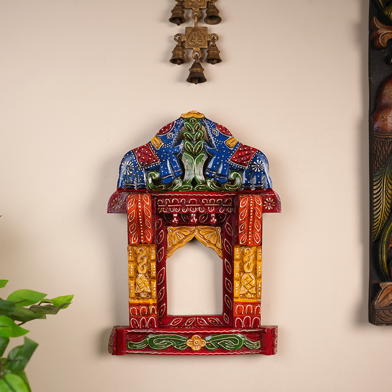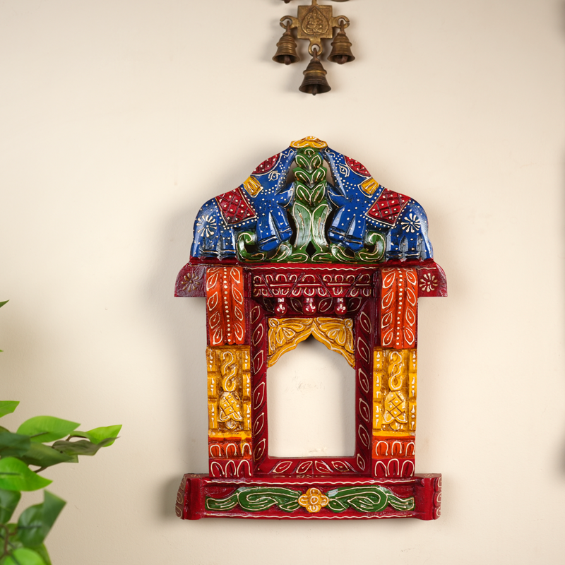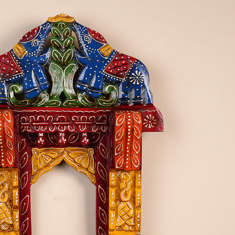 This exquisite hand-carved wooden arch frame features two majestic elephants facing each other, symbolizing strength, wisdom, and prosperity. Adorned with intricate floral and geometric motifs, the vibrant hues of red, yellow, blue, and green beautifully highlight the craftsmanship and cultural richness of traditional Indian art. Perfect for framing idols, mirrors, or as an elegant standalone decor piece, this handcrafted arch brings an aura of grandeur and divine grace to any space.