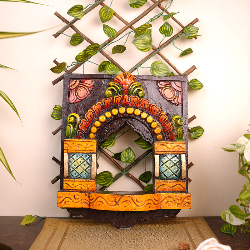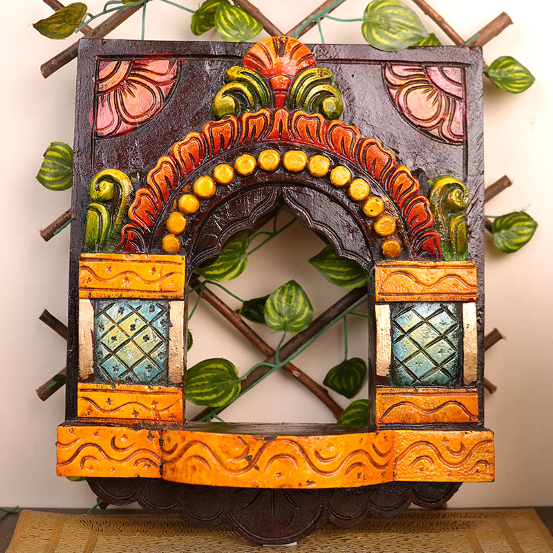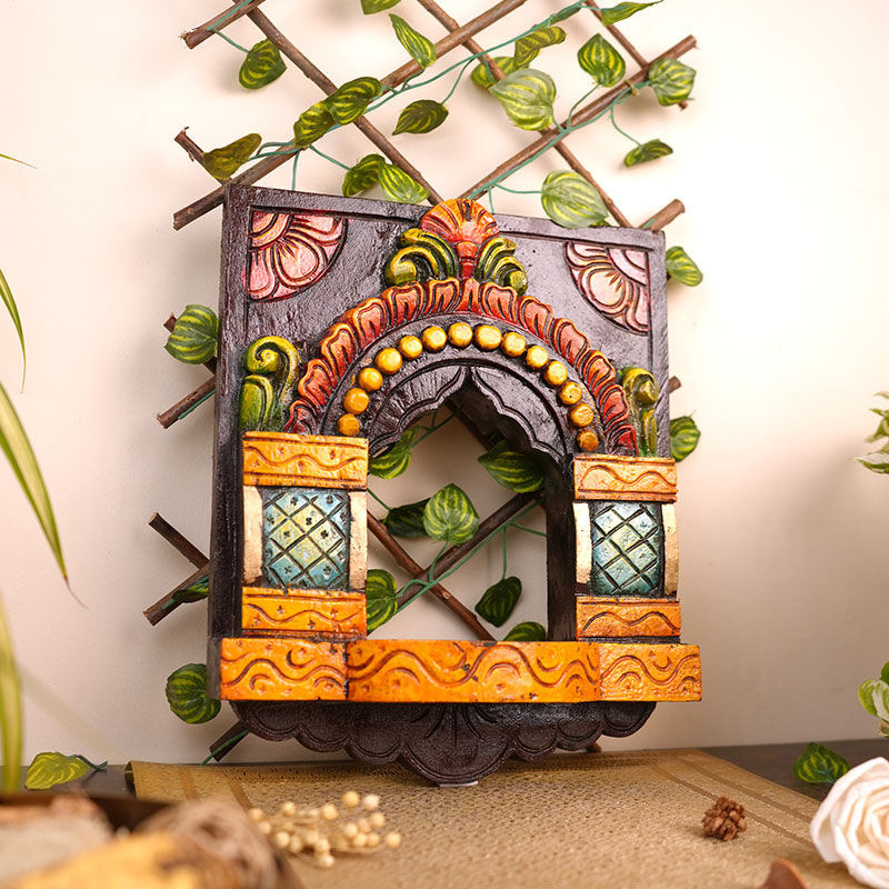 This beautifully hand-carved wooden piece features a traditional arched window design inspired by classic Indian temple and haveli architecture. The intricate carvings along the arch, pillars, and base showcase skilled craftsmanship, with every curve and pattern carefully shaped by hand.